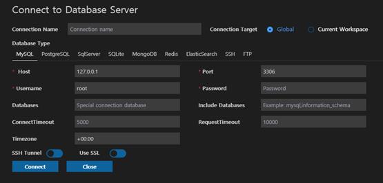 - Connection 페이지가 활성화 되고 정보를 입력하고 Connect를 한다.