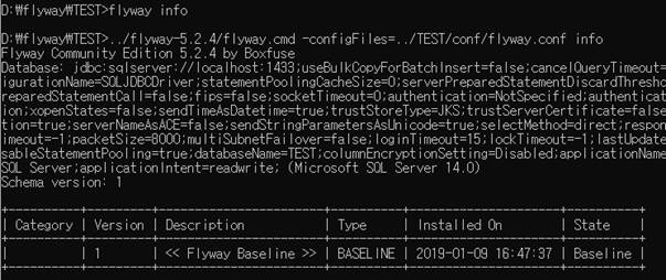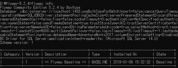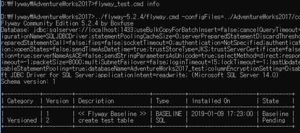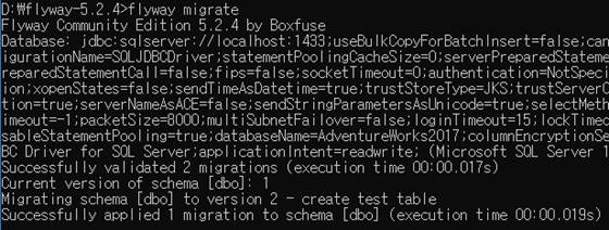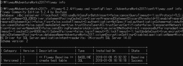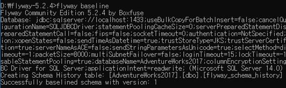 ex) ../flyway-5.2.4/flyway.cmd -configFiles=../AdventureWorks2017/conf/flyway.conf %*